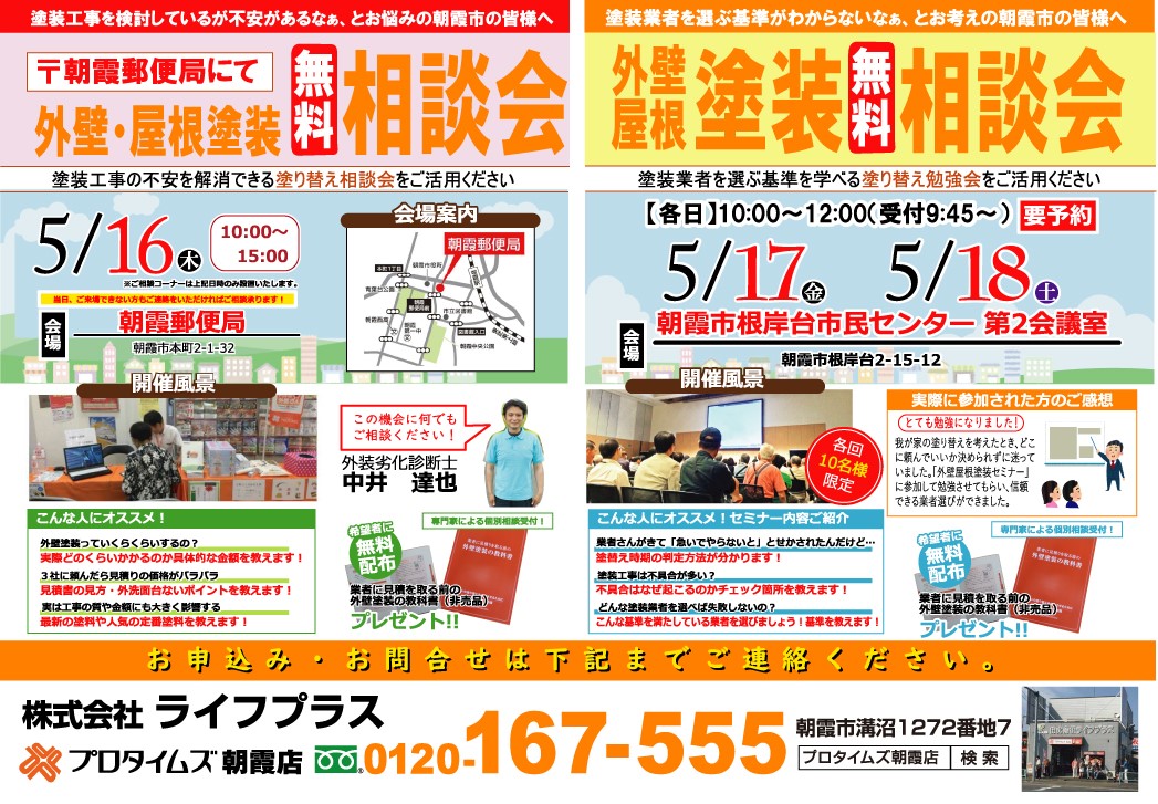 LINE相談 お問い合わせ 相談・来店予約 電話で見積り・相談 0120-167-555 【受付】8:15~18:00【定休日】日曜・祝日・お盆・年末年始 電話で見積り・相談 HOMEイベント・チラシ・セミナーイベント【要予約】5/17(金)5/18(土)朝霞市根岸台市民センターにて外壁・屋根塗装無料勉強会を開催します 【要予約】5/17(金)5/18(土)朝霞市根岸台市民センターにて外壁・屋根塗装無料勉強会を開催します(終了しました) 開催日時 各日10時〜12時 ※受付9:45〜(会場:朝霞市根岸台市民センター第2会議室) 詳しくはこちら > 開催日時 各日10時〜12時 ※受付9:45〜 会場 朝霞市根岸台市民センター第2会議室 会場住所 朝霞市根岸台市民センター 参加費 無料 定員 10名 アクセスマップを確認する イベント一覧はこちら イベント・チラシ・セミナー一覧はこちら ライフプラスについて コンセプト 会社案内 スタッフ紹介 リフォームメニュー リフォームメニュー一覧 トイレリフォーム エコキュート・給湯器 キッチンリフォーム 浴室リフォーム 洗面化粧台 ビルトインコンロ 内装 屋根・外壁塗装 施工事例 施工事例一覧 トイレリフォーム エコキュート・給湯器 キッチンリフォーム 浴室リフォーム 洗面化粧台リフォーム 水廻り修理 屋根・外壁塗装 介護リフォーム 内装リフォーム 扉・ドア お客様の声 お客様の声一覧 お役立ち情報 価格表 イベント・チラシ・セミナー LINE相談 リフォームの流れ よくある質問 プライバシーポリシー お問い合わせ 相談・来店予約 COMPANY コンセプト会社案内スタッフ紹介 WORKS 施工事例一覧 トイレリフォーム エコキュート・給湯器 キッチンリフォーム 浴室リフォーム 洗面化粧台リフォーム 水廻り修理 屋根・外壁塗装 介護リフォーム 内装リフォーム 扉・ドア VOICE お客様の声一覧 CONTENTS 価格表イベント・チラシ・セミナーLINE相談リフォームの流れよくある質問プライバシーポリシー CONTACT 相談・来店予約 © 2018 株式会社ライフプラス