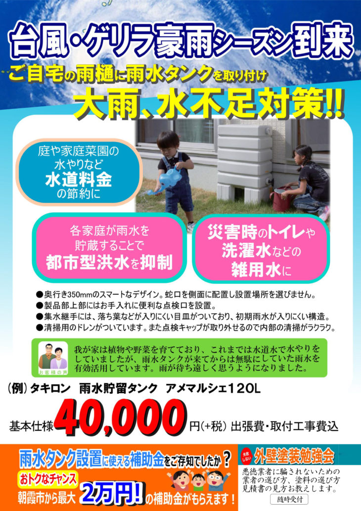 LINE相談 お問い合わせ 相談・来店予約 電話で見積り・相談 0120-167-555 【受付】8:15~18:00【定休日】日曜・祝日・お盆・年末年始 電話で見積り・相談 HOMEイベント・チラシ・セミナーチラシ台風・ゲリラ豪雨シーズン到来 台風・ゲリラ豪雨シーズン到来(終了しました) コメント ご自宅の雨樋に雨水タンクを取り付け、大雨・水不足対策!! チラシ一覧はこちら イベント・チラシ・セミナー一覧はこちら ライフプラスについて コンセプト 会社案内 スタッフ紹介 リフォームメニュー リフォームメニュー一覧 トイレリフォーム エコキュート・給湯器 キッチンリフォーム 浴室リフォーム 洗面化粧台 ビルトインコンロ 内装 屋根・外壁塗装 施工事例 施工事例一覧 トイレリフォーム エコキュート・給湯器 キッチンリフォーム 浴室リフォーム 洗面化粧台リフォーム 水廻り修理 屋根・外壁塗装 介護リフォーム 内装リフォーム 扉・ドア お客様の声 お客様の声一覧 お役立ち情報 価格表 イベント・チラシ・セミナー LINE相談 リフォームの流れ よくある質問 プライバシーポリシー お問い合わせ 相談・来店予約 COMPANY コンセプト会社案内スタッフ紹介 WORKS 施工事例一覧 トイレリフォーム エコキュート・給湯器 キッチンリフォーム 浴室リフォーム 洗面化粧台リフォーム 水廻り修理 屋根・外壁塗装 介護リフォーム 内装リフォーム 扉・ドア VOICE お客様の声一覧 CONTENTS 価格表イベント・チラシ・セミナーLINE相談リフォームの流れよくある質問プライバシーポリシー CONTACT 相談・来店予約 © 2018 株式会社ライフプラス