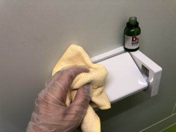薬剤は噴霧15秒で殺菌をするので、その後拭き取ります。