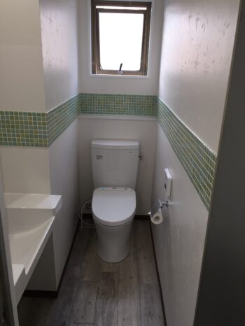 トイレ交換後のご感想で、「汚れがつきにくくて嬉しい!アクセントのモザイクタイルや丸いミラーで明るい雰囲気になった!」とのお声を頂き、当社としても大変うれしく思います。ありがとうございます!