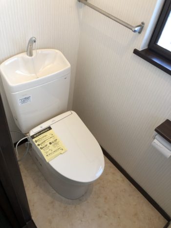 一般的なトイレを交換する場合にはお掃除のしやすいフチレスタイプをご提案しております。クッションフロアはもちろん、壁紙まで交換をすることにより全てがきれいにないります。